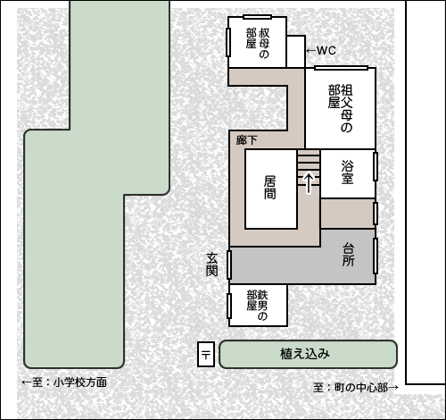 「居間の向こうに廊下があって、コの字型になってて、途中にじいさんとばあさんのでかい部屋があって、そこに二階が乗っかってたな。で、トイレがあって、さらにその向こうにもうひとつ部屋が、今考えるとオレの部屋だけじゃなくて、その向こうの部屋も増築だな。そこに、心臓を患ってた人が」