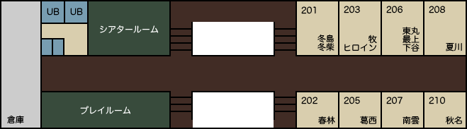 大階段を上がってすぐ、客室が並ぶ2階東側の手前にある201号室が柴さんと島さん。その隣、203号室の牧とを挟んで東丸ら同窓会組の男性陣が206号室。最奥が208号室で敬さん。白蝋館では客室番号が互い違いに振られているようで、敬さんの向かいが210号室となっており、メイさんが使用している。続いて207号室が志緒さん、205号室が酔っ払ってに絡んできた葛西という女性、202号室が春林という夫婦、で今夜は満室。